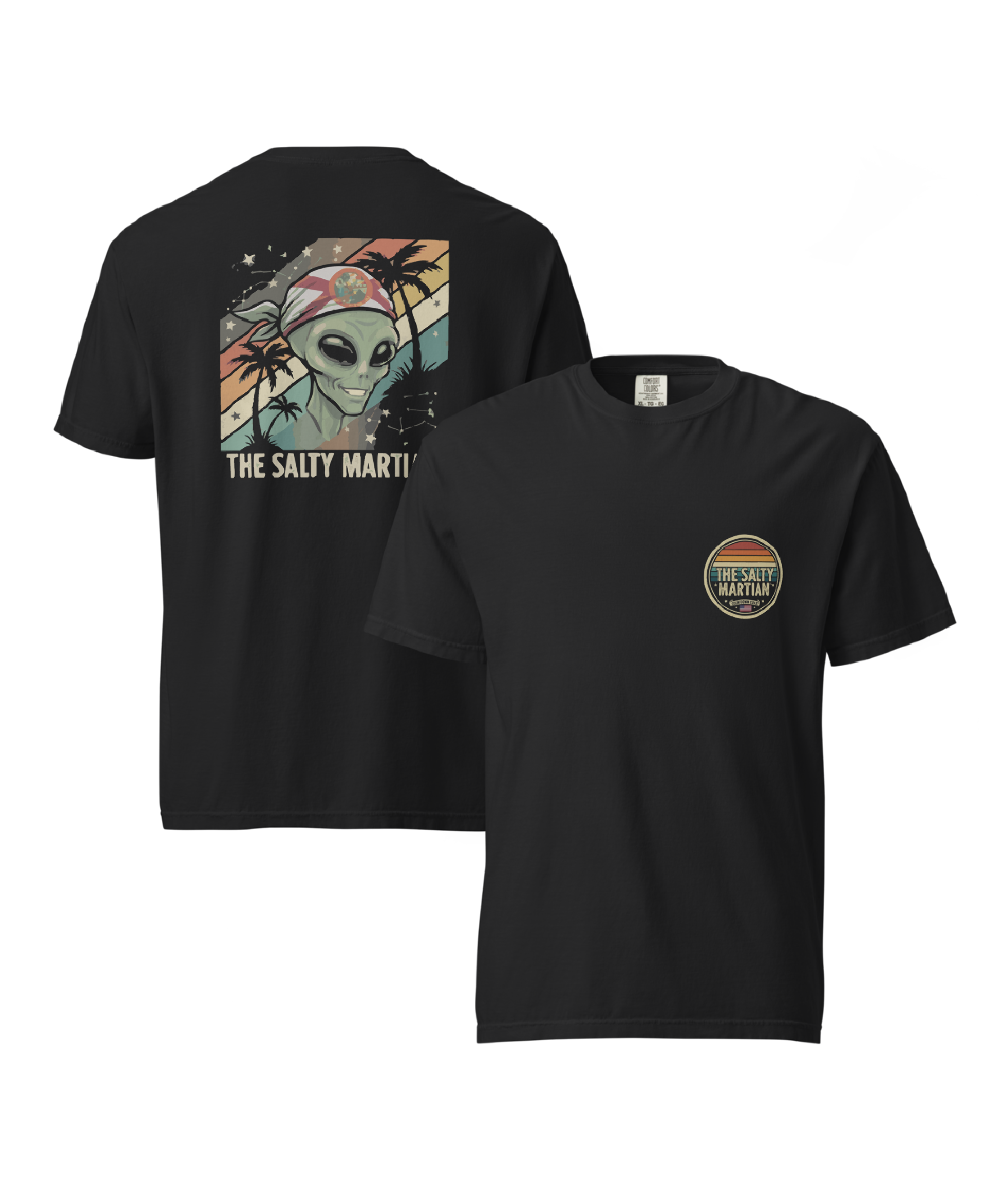 Introducing The Salty Martian - the inaugural shirt from our new collection. This retro-inspired tee features a playful Martian sporting a State of Florida Flag inspired head wrap, blending cosmic vibes with a splash of coastal Florida.